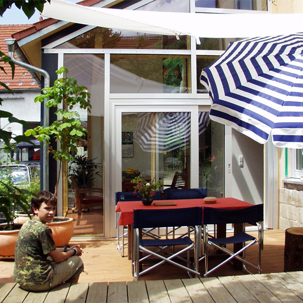 Die Aufstockung stellte auf dem kleinen innerörtlichen Grundstück die Platz-sparendste Lösung dar. Durch den Anbau eines Wintergartens