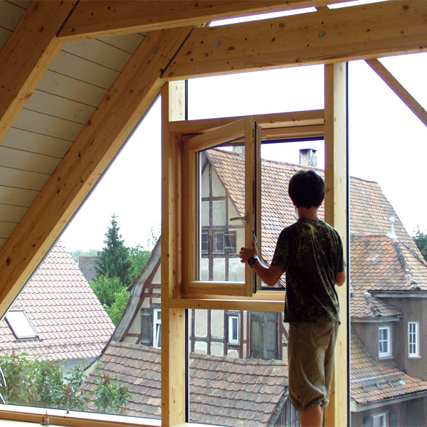 Im bis zum First offenen Dachgeschoss mit vollständiger Pfosten-Riegelverglasung des Giebels entsteht ein luftiger Kreativraum für die Bauherrin.